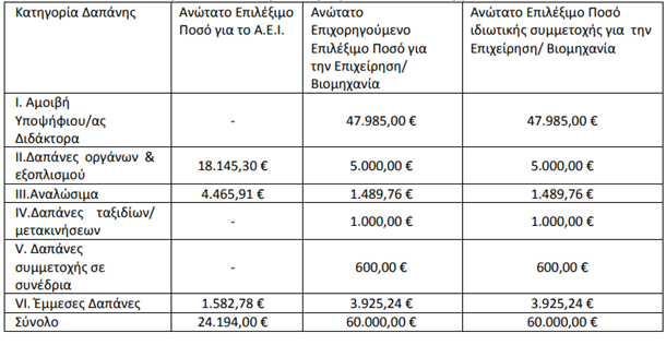 | ΠΟΣΟΣΤΟ ΧΡΗΜΑΤΟΔΟΤΗΣΗΣ | 100% έως και το ποσό των 24.194,00 ευρώ για τα Α.Ε.Ι.50% της συνολικής επιλέξιμης δαπάνης με ανώτατο ποσό τις 60.000,00 ευρώ |